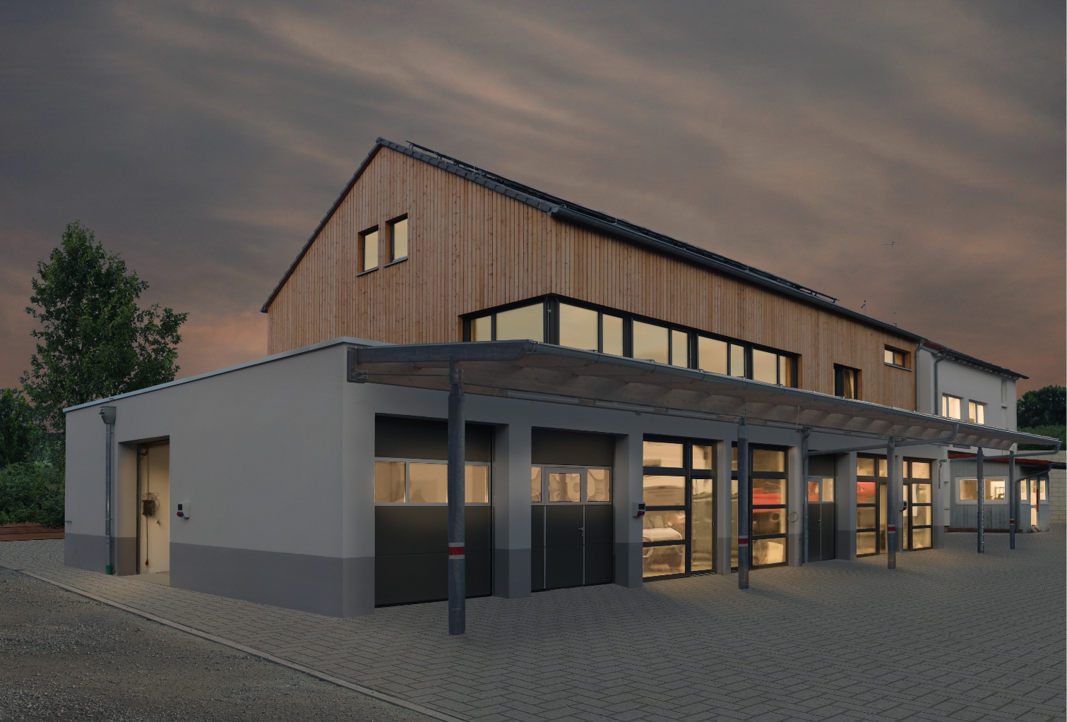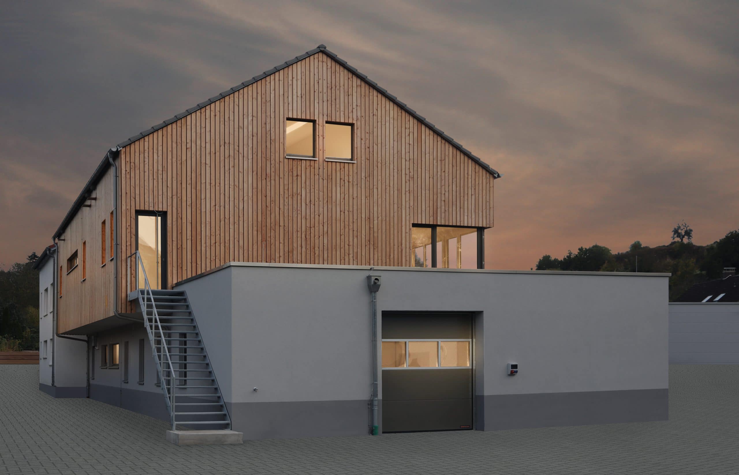 Unser Gedanke: ein Betriebshof mit Bezug zur Natur. Mit Respekt vor Bestehenden – und dem Mut zu einer überraschenden Fortführung. Denn zusätzlicher Raum war zwingend. Und das schnell. Wir haben deshalb den Bestand aufgenommen, das Untergeschoss etwas verschoben und zugleich vergrößert. Die Bauweise zeigt sich klar, kubisch, modern, ohne Dachüberstand. Schnell anfahrbare Lagerflächen, Garagen und Notdienst-Stellplätze und eine überdachte Ladefläche kamen hinzu. Bestandsgebäude und Neubau sind durch einen Steg verbunden. Der Lift im Neubau macht gleichzeitig den Bestand barrierefrei und das Dachgeschoss zugänglich.