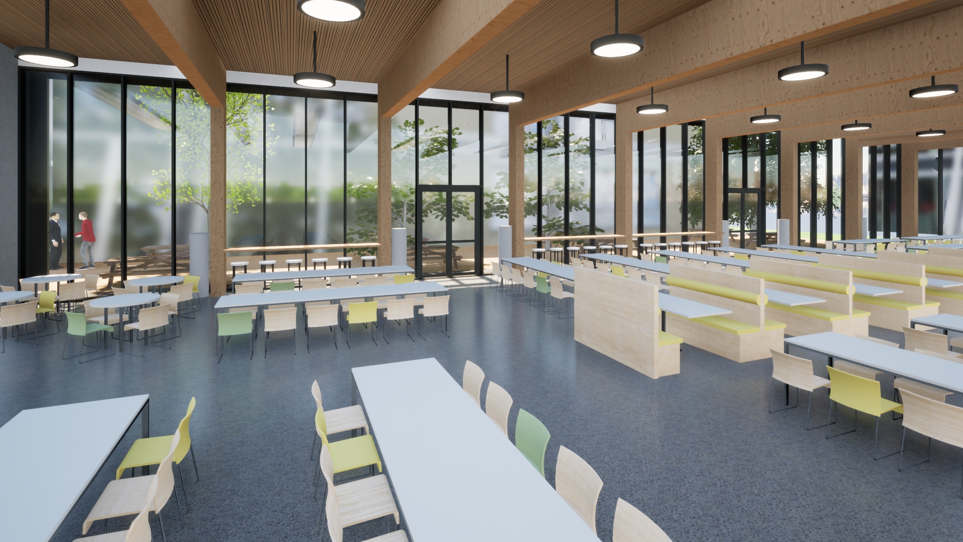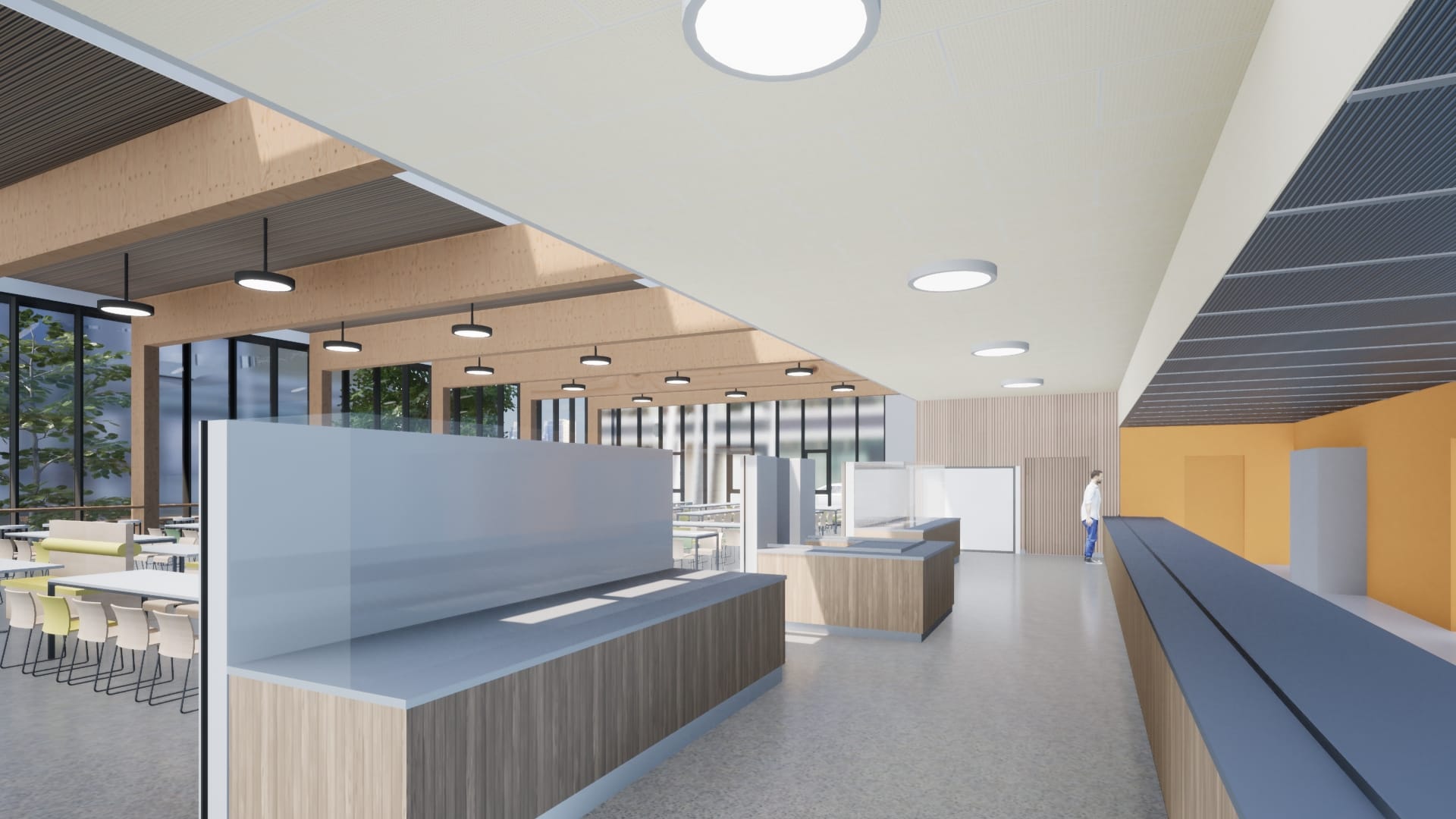 Die Vergrößerung der Grundfläche begünstigt den Küchenbetrieb durch ebenerdige Lagermöglichkeiten. Weitere Optimierungsmöglichkeiten ergeben sich durch die optimale Abstimmung von Funktionsbereichen und Technikräumen, angepasste Raumgrößen und -höhen sowie reduzierte Leitungswege. Der offene Eingangsbereich fungiert nicht nur als Zugang zum Gebäude, sondern auch als Informations- und Treffpunkt. Mit einer Kaffeebar, Getränkeautomaten und Sitzgelegenheiten schafft er eine einladende Atmosphäre. Der Speisesaal bietet Platz für 360 Sitzplätze, die durch Raumtrennelemente und alternative Platzangebote eine angenehme Atmosphäre erhalten. Die Essensausgabe ist im Küchenbereich integriert, wobei hygienische Anforderungen ohne raumabschließende Trennung erfüllt werden.