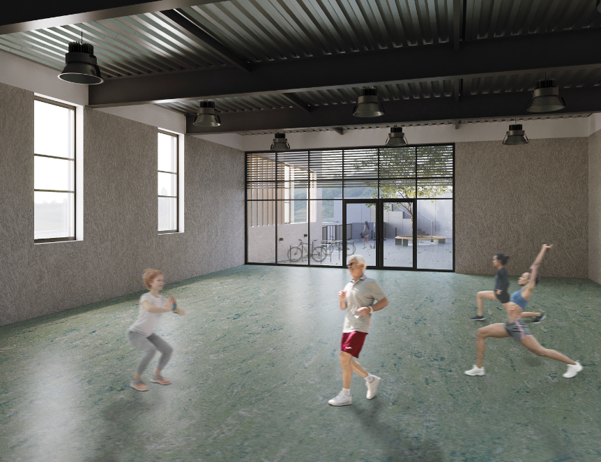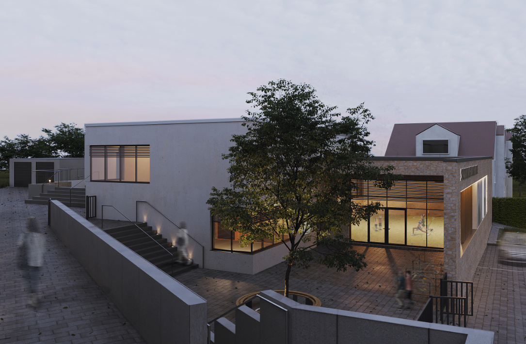 Eingegliedert in die Nachbarbebauung, hat unser Konzept die Stadt Bad Homburg und die Bürgerinitiative überzeugt. Lüftungsgeräte sind aus Gründen der Schallemission ins Gebäudeinnere verlegt. Der Innen-hof hat zur Straße eine große Wandscheibe in Höhe der Gymnastik-halle sowie eine Mauer zur Abgrenzung der Toranlage erhalten. Zugang für alle, das war uns wichtig. Denn Verein ist Breitensport und Schule Bildung für alle. Komplett ebenerdig erschlossen sind die Räumlichkeiten barrierefrei, teils über Rampen, erreichbar. Einen Platz zu schaffen, wo man sich treffen kann und treffen möchte, diesen Anspruch teilen wir als PA+ Architekten mit allen Beteiligten.